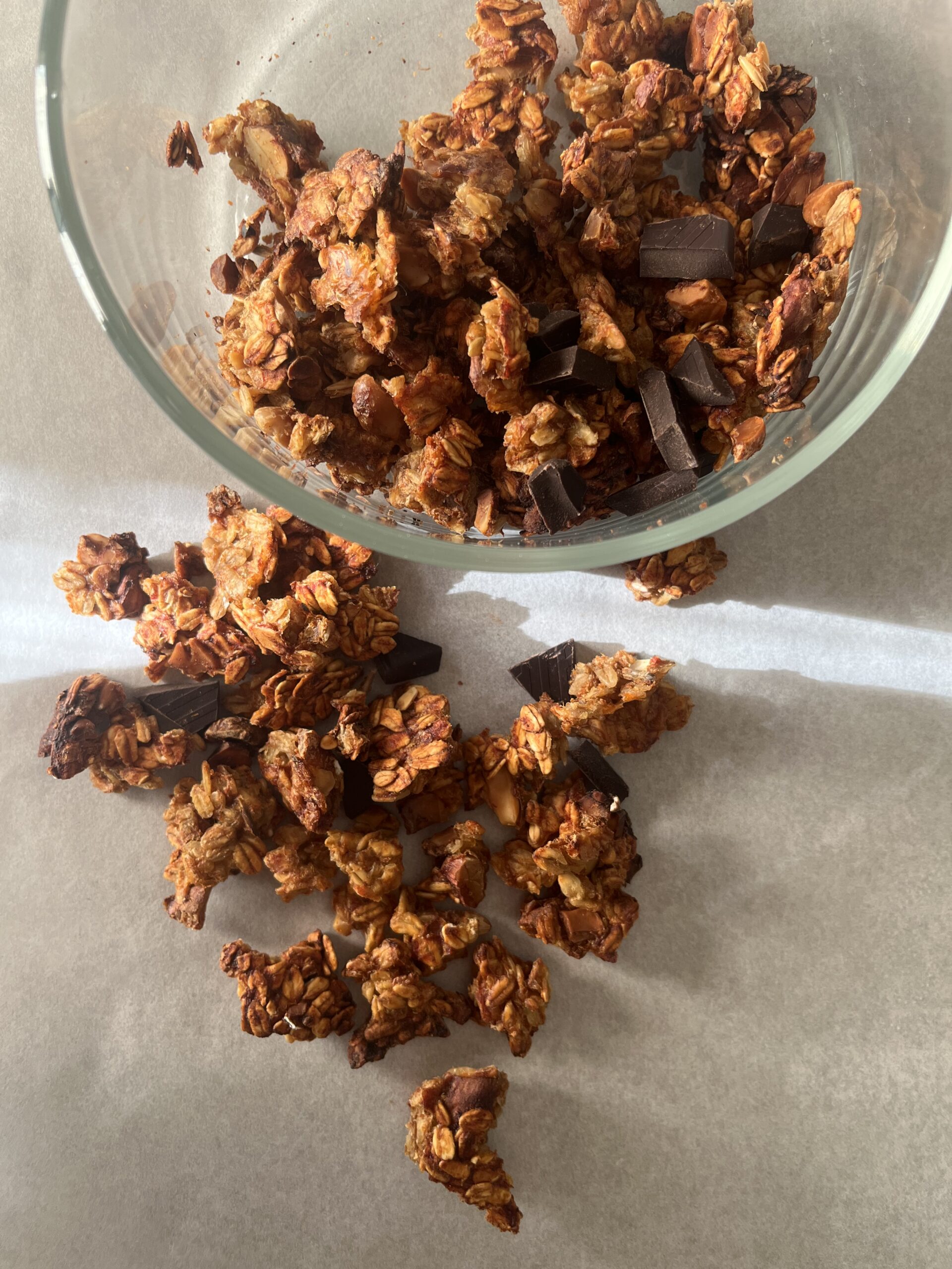 - estrai la granola dal forno e aggiungi il cioccolato fondente tagliato grossolanamente