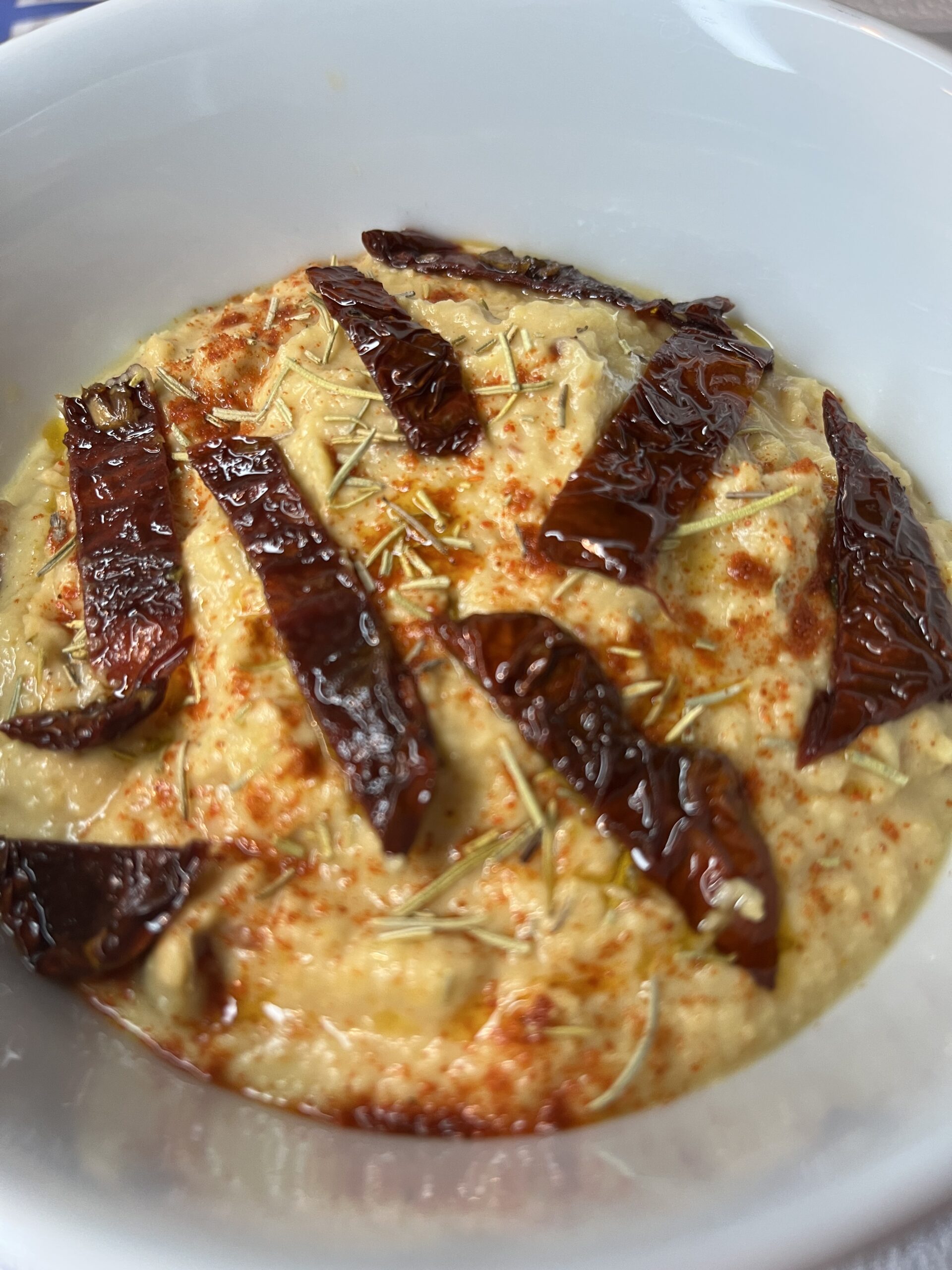 Hummus di ceci con pomodori secchi e olive: dal Medioriente alla Puglia