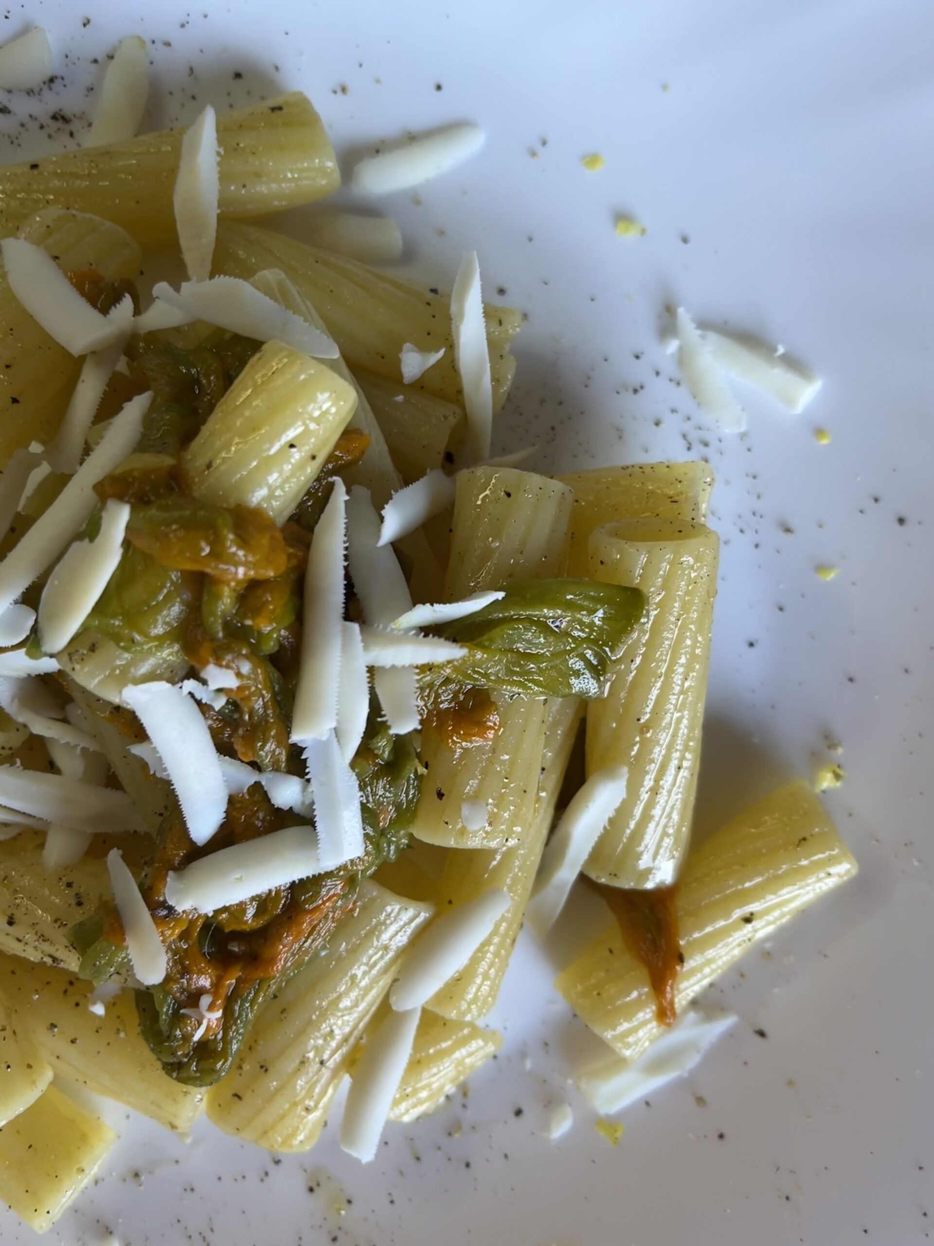 Rigatoni con fiori di zucca Cacioricotta pugliese e zeste di limone